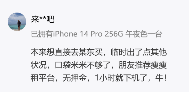 在瘦瘦租,我们不看征信,不查芝麻分,全部免押金,您无需担心自己信用不佳或是“黑户”导致被拒。